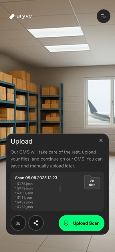 After your scan has been succesfully uploaded, you can continue finalizing your Location setup on aryve Studio. Helpful links:
