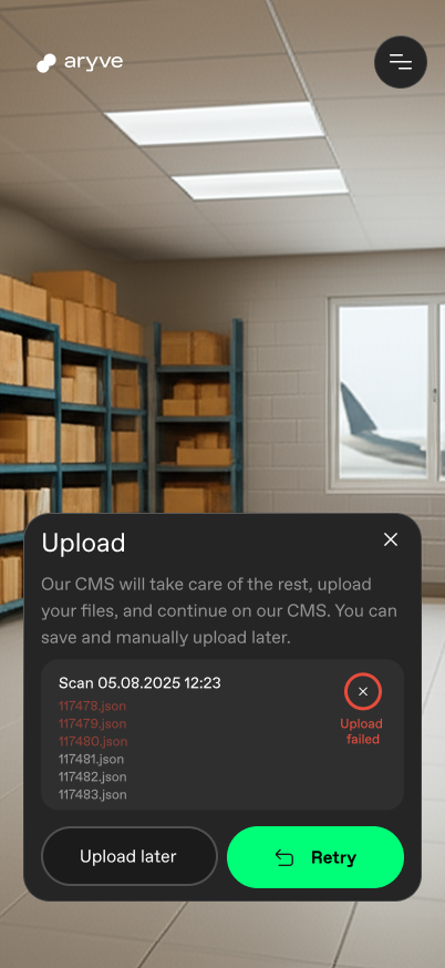 If you want to upload the scan to the chosen Location, select the Upload button, confirm you want to remove the current data at the Location with the new scan and wait for the upload to complete. In case the upload has failed, retry the process. If this fails again, check your data on the aryve Studio or contact us.