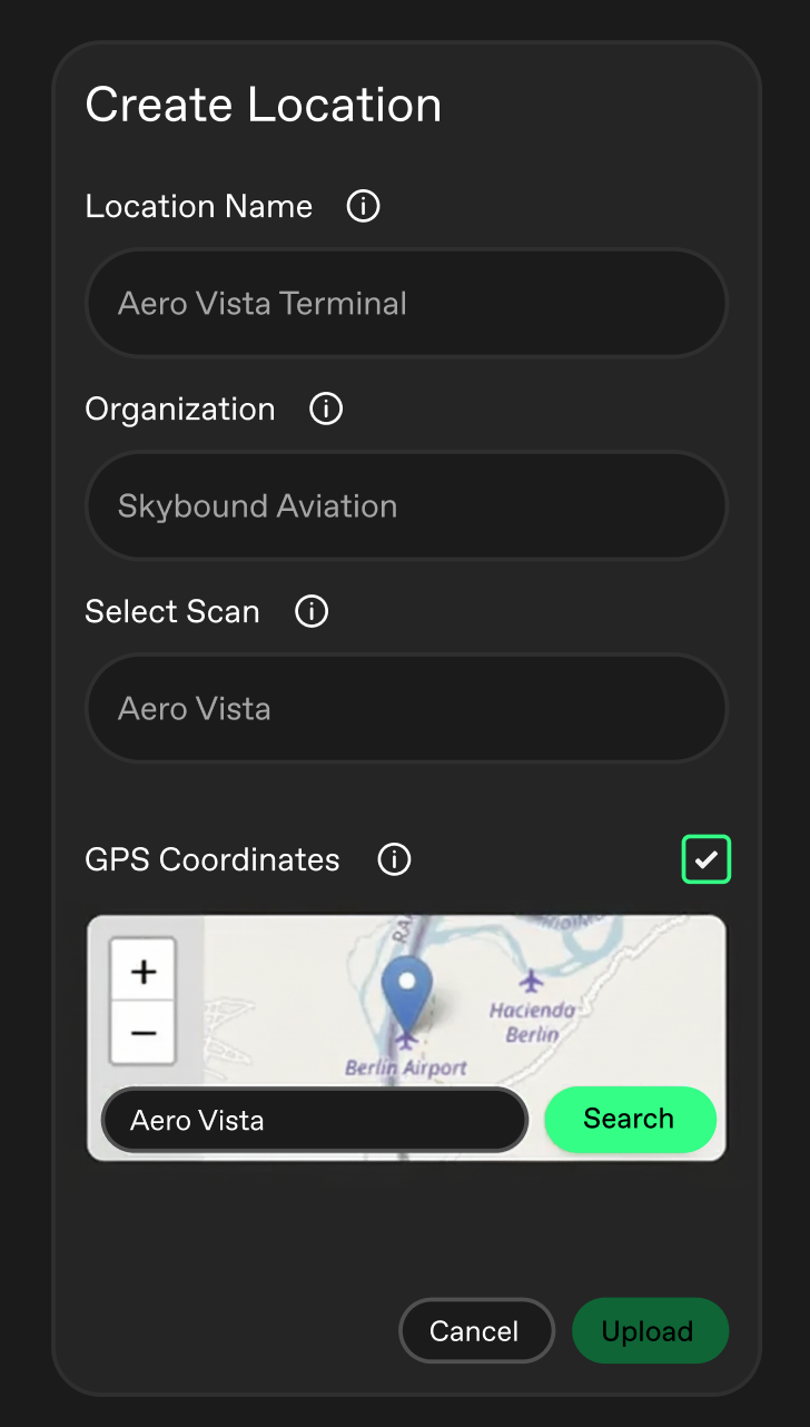 A pop-up window will then appear. Enter a name for your location, assign it to an organization available on the list, and select the scan you want to use (that has previously been uploaded to the aryve Studio).