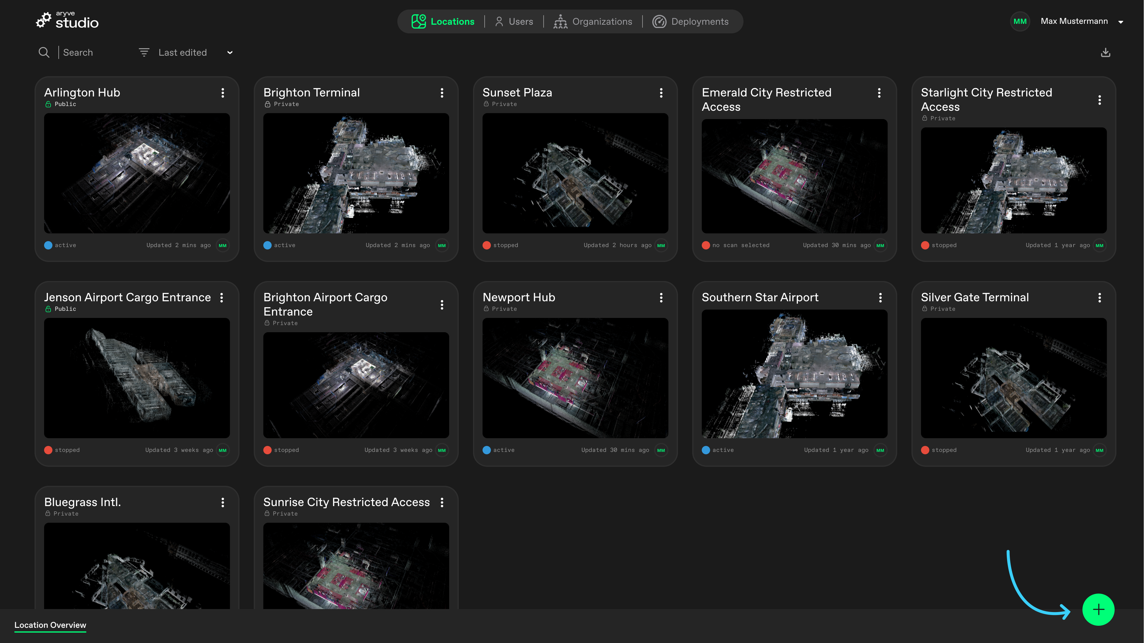 To create a new location in aryve Studio, go to the Locations page and click the (+) icon at the bottom-right of the main view.